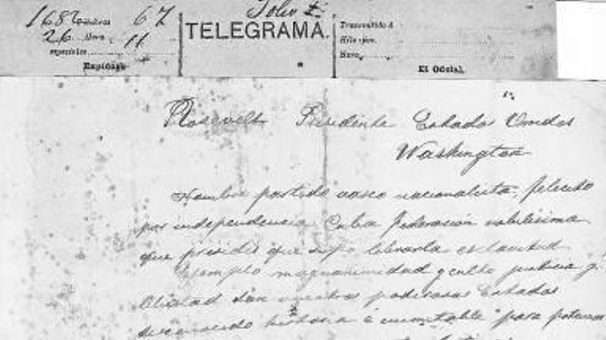 Capacidad de reacción Es destacable la estrategia del fundador del Partido Nacionalista Vasco de intentar atraer la atención de la emergente gran potencia norteamericana, defensora de los pueblos oprimidos, que tan solo tres años antes había derrotado militarmente, en apoyo a la insurgencia cubana, al reino cuya opresión sufría la mayor parte del País Vasco. Pero también es muy notable la capacidad de reacción de Sabino de Arana ante acontecimientos imprevistos como el que nos ocupa y la utilización de todos los medios a su alcance para buscar el beneficio para su causa, la supervivencia de un País Vasco, que generalmente se daba ya por perdida. Patria mía? ¿acaso he nacido yo para verte morir? Al año siguiente, tras el reconocimiento de la independencia de Cuba por el Gobierno norteamericano, el 24 de mayo de 1902 Sabino de Arana intentó enviar al presidente Roosevelt una nueva felicitación, redactada en los siguientes términos: