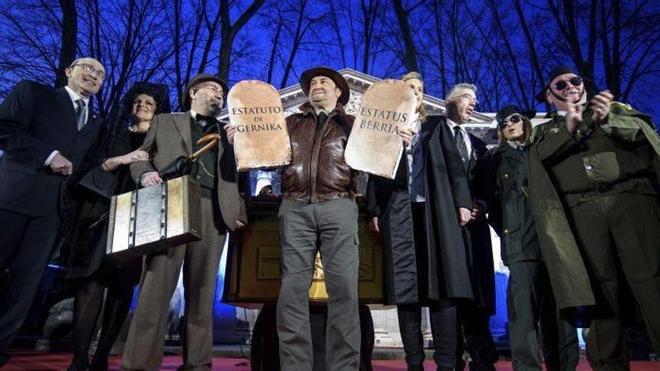 En ese momento, Andoni Ortuzar, en el papel de Indiana Jones, ha accedido al escenario y con la ayuda de Iñigo Iturrate ha conseguido que ministra, delegado, jueces y agentes se apartaran del cofre por lo que ha rescatado de su interior el Estatuto de Gernika y ha extraído un ejemplar del nuevo estatus.