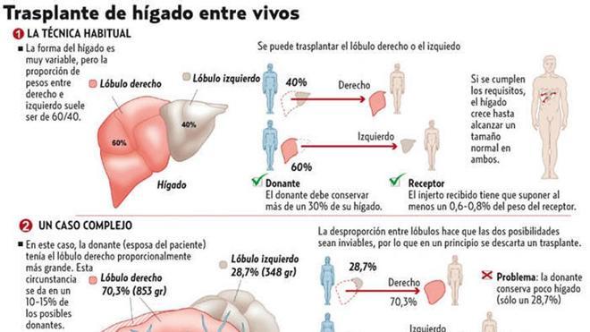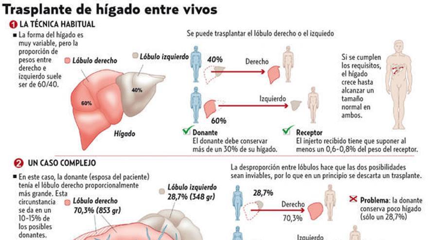 En ocasiones, las características del hígado del donante impiden mantener la proporción adecuada entre el volumen del injerto necesario para donar al receptor y el que debe quedar en el donante. En estos casos, si se extrae uno de los dos lóbulos -izquierdo o derecho-, el donante puede quedar con un volumen de hígado insuficiente para un funcionamiento hepático adecuado.