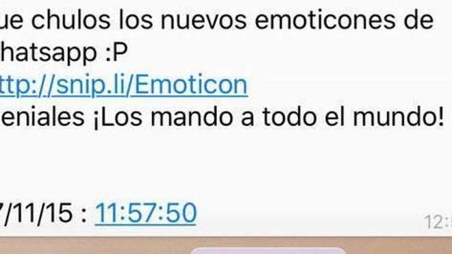 IRUÑEA. ¡Mucha atención! La Policía Foral ha avisado este lunes de un nuevo mensaje por WhatsApp que no debe abrirse. Se trata de un SMS en cadena que avisa de la disponibilidad de "nuevos emoticonos" en dicha red social. La Policía Foral advierte a los usuarios de que no deben pinchar ni reenviar tal mensaje, ya que es una maniobra para "hacerse con tus contactos".
