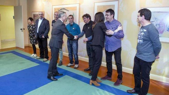 Horas más tarde, los responsables de la 20ª edición de la Korrika se acercaron hasta la sede de Lehendakaritza en Gasteiz donde fueron recibidos por el lehendakari Iñigo Urkullu y la viceconsejera de Política Lingüística, Miren Dobaran, a quienes informaron de primera mano de los detalles de la carrera a favor del euskera unirá Otxandio y Iruñea entre mañana y el 9 de abril en un recorrido de 2.535 kilómetros en el que el testigo atravesará ciudades y pueblos de Euskadi. - DEIA