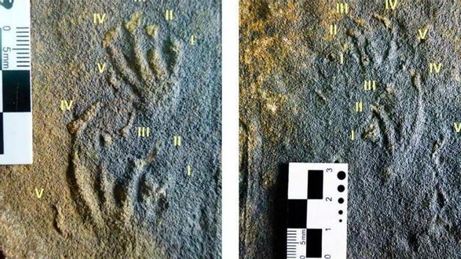 En ambos vestigios, las icnitas (huellas fosilizadas) de las manos y de los pies varían de tetradáctilas a pentadáctilas, son asimétricas y la longitud de los dedos aumenta progresivamente.