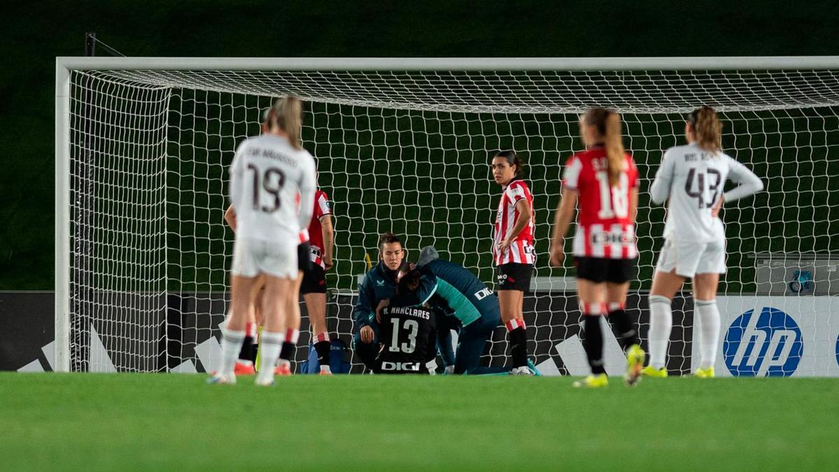 La victoria del Athletic ante el Real Madrid (0-1) en su visita de este martes al Alfredo Di Stéfano ha empezado con un buen susto. Adriana Nanclares, la portera titular del conjunto rojiblanco, ha tenido que dejar el terreno de juego a los 6 minutos de juego después de recibir de forma fortuita un golpe en la cabeza. Según ha detallado la entidad bilbaina en un primer parte médico, ha sido trasladada a un hospital por precaución para realizarle las pruebas pertinentes, conforme al protocolo de contusión cerebral.