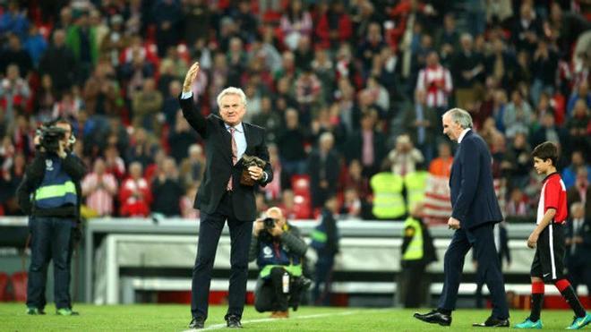 BILBAO. El acto tuvo lugar en el descanso del partido de Liga entre el Athletic y la Unión Deportiva Las Palmas. Iribar y Maier se dirigieron al centro del campo, donde 'El Chopo' le hizo entrega al homenajeado del trofeo acreditativo en medio de una cálida ovación de los más de 36.000 aficionados que se dieron cita en las gradas de 'La Catedral'.