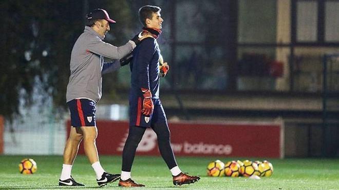 Kepa Arrizabalaga fue la gran novedad en el entrenamiento vespertino que llevó a cabo ayer la primera plantilla del Athletic, que también se ejercitó por la mañana. El portero de Ondarroa, que el pasado sábado debutó con España ante Honduras, no jugó el martes ante Rusia en San Petersburgo, donde regresó de madrugada. Arrizabalaga es el protagonista de la actualidad rojiblanca por la negociación que mantiene con el club para ver si renueva o no. Foto: Borja Guerrero