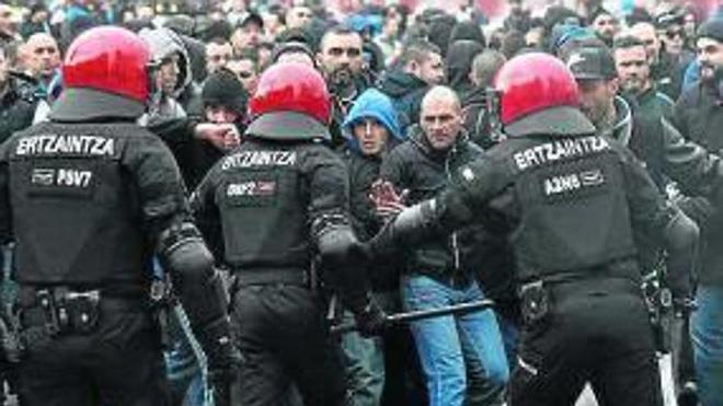 BILBAO. Aquel 25 de febrero de 2016 los incidentes se saldaron con cinco aficionados detenidos, otro herido tras recibir un botellazo en el cuello y dos ertzainas lesionados con sendos golpes.
