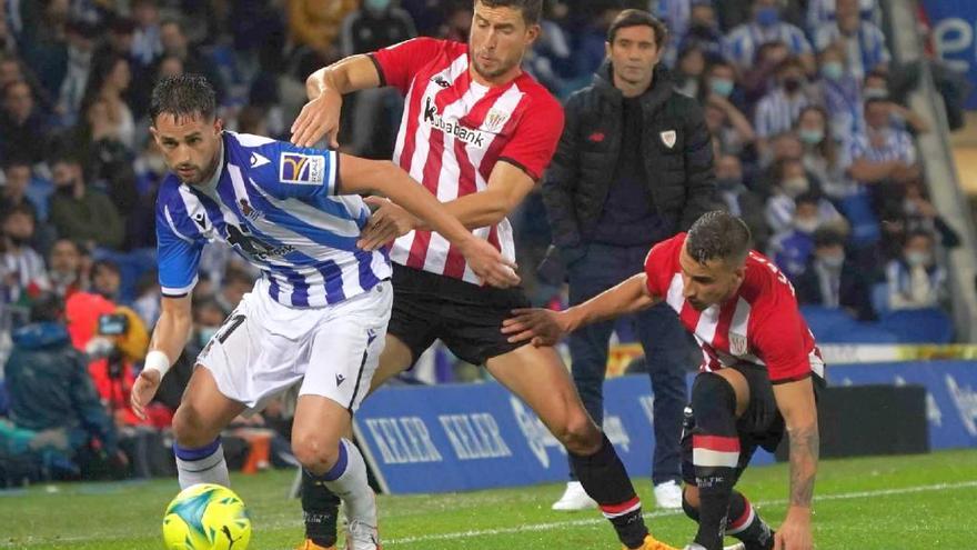 El domingo por la noche, mal que les pese, los aficionados de la Real Sociedad tendrán que seguir el derbi de San Mamés por televisión. Lo mismo que los seguidores del Athletic que no son socios o los Gazte Abonoa. Los números son los que son. Hasta el próximo 4 de marzo, con la sexta ola de la pandemia remitiendo, el aforo de los estadios no será completo. Por lo que 'La Catedral', por ahora, no podrá abrir sus gradas más del 85%. Es decir, 45.331 asientos están disponibles. De ellos, 43.425 pertenecen a los socios de la entidad, 1.200 a los abonados más jóvenes, y el restante se reparten entre los que cuentan con palco VIP y los compromisos del club. Una realidad que ha imposibilitado que salgan entradas a la venta para el público general y que el Athletic envíe -como suele ser habitual en condiciones normales- localidades para los aficionados txuri-urdin. Lo mismo le ocurrió al Valencia con motivo del partido de ida de las semifinales de Copa del pasado jueves.