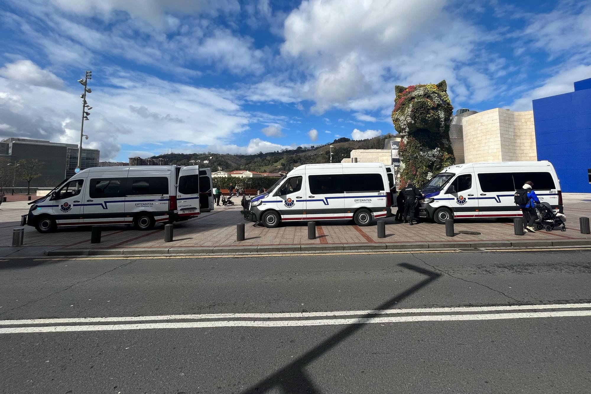 Patrullas de la Ertzaintza frente al Museo Guggenheim, desde donde saldrán hacia San Mamés los hinchas de la Roma