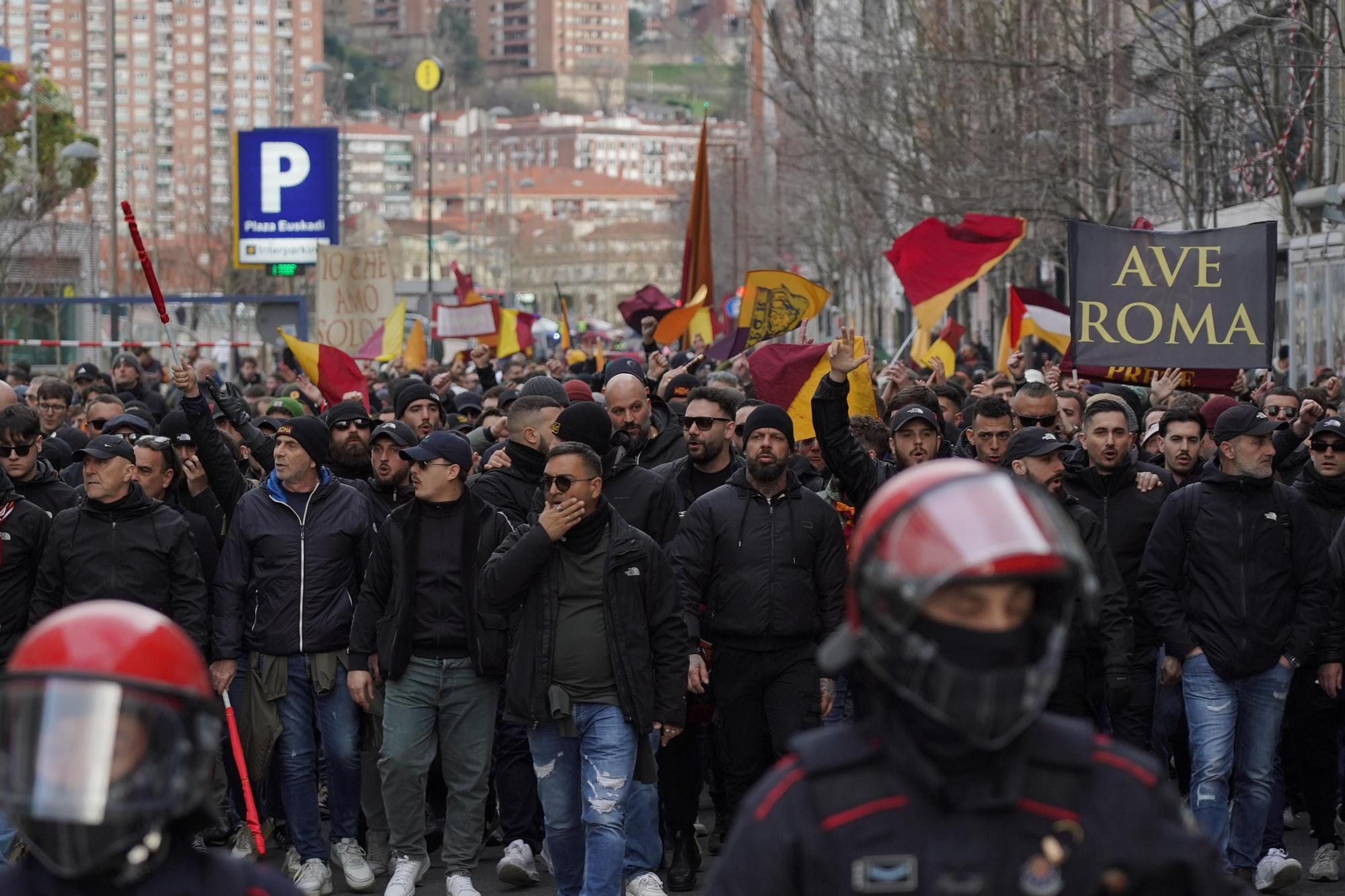 En imágenes: los aficionados de la Roma avanzan hacia San Mamés