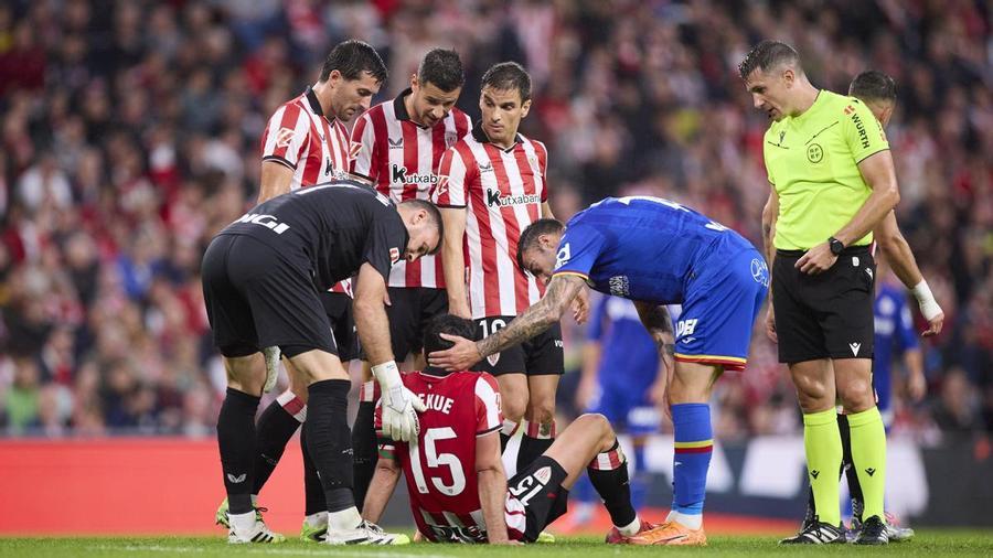 Aymeric Laporte e Iñigo Lekue son los últimos jugadores del Athletic en visitar la enfermería rojiblanca. El primero, al menos, pudo completar el encuentro ante el Getafe, pero jugó los minutos finales del choque, en torno a 20 minutos, con molestias en su tobillo izquierdo tras apoyar mal en un salto de cabeza con un rival. Por este motivo tuvo que ser atendido por los servicios médicos del club sobre el césped y, aunque Ernesto Valverde amagó con dar entrada a Aitor Paredes, recibió el visto bueno del central de Agen y este no salió del campo. Ayer el club desveló que sufre un “esguince en el complejo ligamentario externo del tobillo izquierdo”. Es seria duda para el derbi del sábado contra la Real Sociedad y habrá que ver si puede ser de la partida ante el Newcastle.