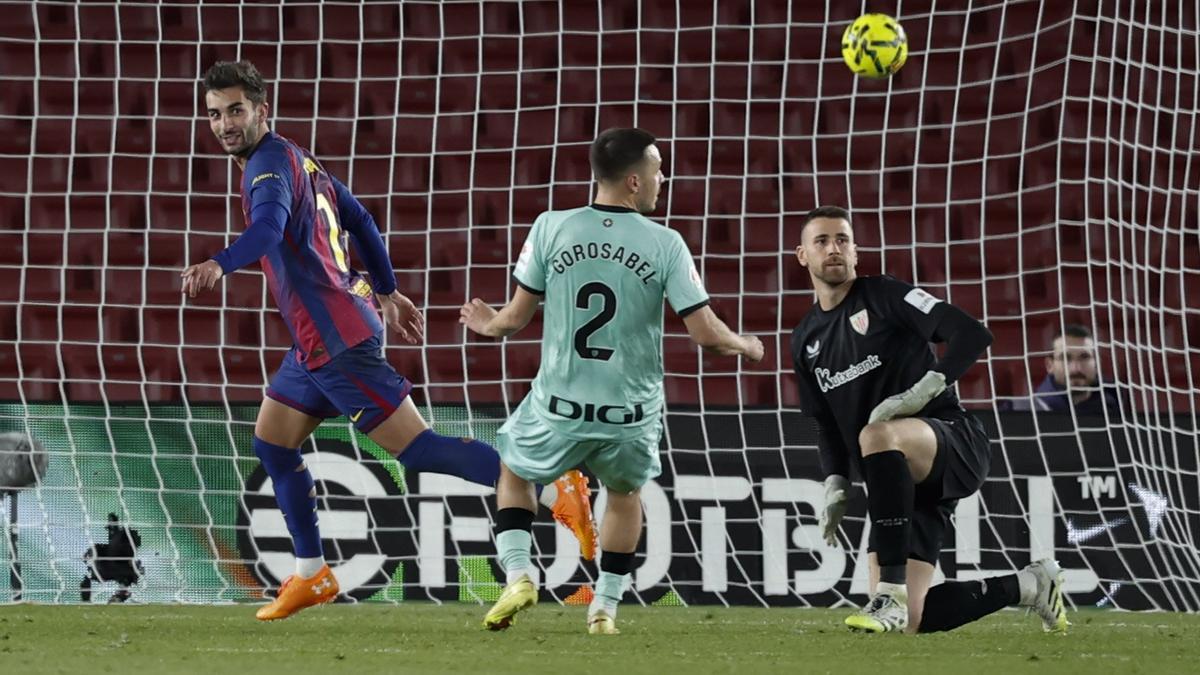 Escenario de un montón de reveses rojiblancos en lo que va de siglo, en su reapertura después de 900 días cerrado por obras el Camp Nou acogió otra victoria de un Barcelona que, sin necesidad de transmitir una gran impresión, tuvo suficiente con inocular a su irregular fútbol la dosis de acierto que faltó en la propuesta de su adversario. El primer tiempo fue paradigmático, un gol nada más empezar y otro justo en los segundos previos al descanso y en medio, de todo, alternativas, equilibrio y un mayor número de oportunidades claras por parte del Athletic. Y cuando esto sucede, que no se canjean por goles los remates propicios ante equipos de máximo nivel mientras el marcador permanece ajustado, las opciones de puntuar se diluyen por completo. Es una reflexión que porta una lógica aplastante, nunca mejor dicho. De poco sirven el trabajo invertido y los méritos expuestos, nada cobra sentido sin una gota siquiera de puntería, sin esa pizca de instinto o de maldad de la que hacen gala tipos como Lewandowski, Ferrán o Fermín, artífices de la ventaja amasada por el anfitrión.