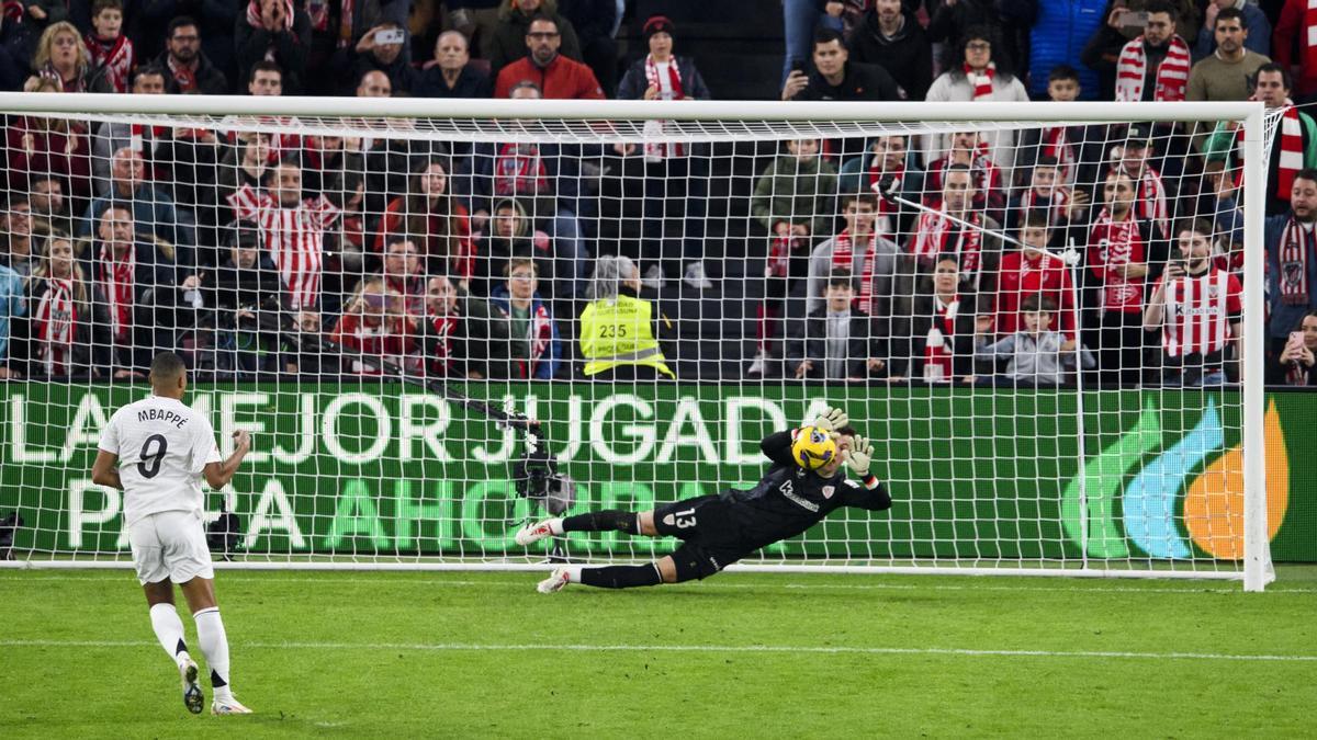 Pero también es verdad que el arquero donostiarra reparó su error con creces al adivinarle a Mbappé las intenciones, estirarse cuán largo es hacia su lado izquierdo y negarle el gol al francés. San Mamés estalló en un delirio colectivo y, a la vez, el atacante blanco quedó atascado en un fango del que le supuso mucho esfuerzo salir.