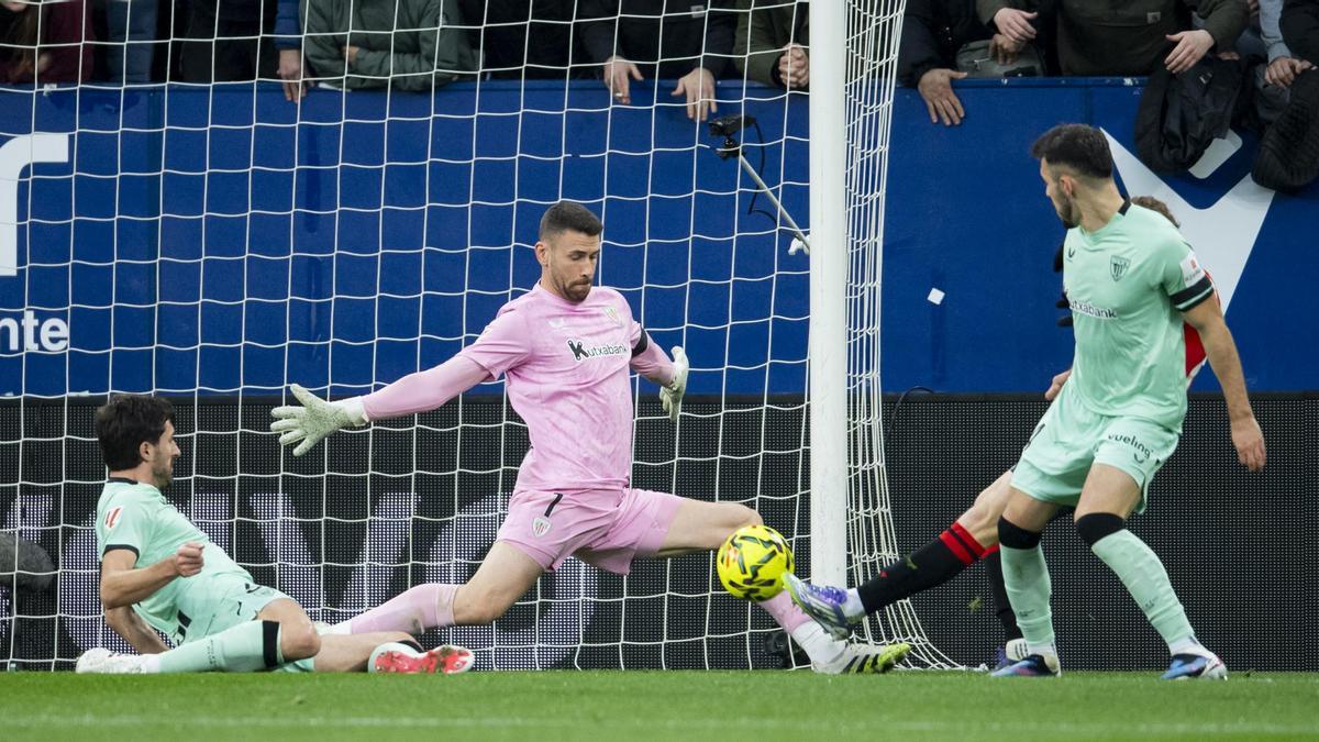 Antes, el portero había evitado que Moncayola estrenase el marcador en un remate desde muy cerca, Budimir había malgastado una jugosa ventaja sobre los centrales para rematar horriblemente y Torró, sin que nadie le importunase en un córner, no supo imprimir fuerza a su cabezazo. No fue un derroche en el plano ofensivo, pero el Athletic no se enteraba de la fiesta, su nulidad era enervante. Todo cambió a raíz del 1-0, Osasuna se tomó un respiro y en cosa de cinco minutos Guruzeta protagonizó dos tiros dentro del área, ambos replicados con apuros por Herrera, y Jauregizar probó de volea desde la frontal.