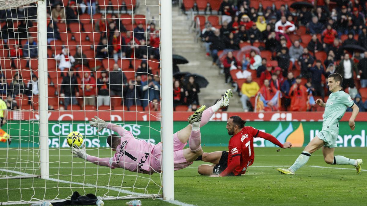 La pelota les quemaba a los isleños y enfrente se percibía dinamismo, pero el partido entró en una fase más anodina hasta que, de repente, los del VAR avisaron al árbitro de una acción ocurrida un poco antes, un centro de Joseph en dirección a Muriqi que Vivian interceptó con un brazo. No lo tenía del todo pegado al cuerpo porque es imposible en carrera, pero le pegó tras leve desvío de Yuri. Dio igual, el del silbato no dudó, penalti: Muriqi tiró horrible, Simón adivinó la dirección pero no pudo sujetar y el ariete fusiló lanzándose al suelo. Tres minutos después, Nico Williams y Unai trazaban una pared que retrataba a la zaga mallorquina mientras el primero colocaba el balón lejos de Leo Román.