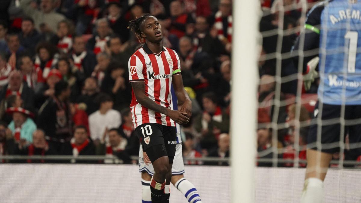 El Athletic salvó un punto in extremis en un derbi que sirvió para volver a ver en escena a los Williams, si bien asomaron por separado, pues Iñaki reemplazó en el minuto 72 a Nico, quien se alistó de inicio desafiando una vez más a una latosa pubalgia que ha mermado su rendimiento desde el comienzo de la temporada. Apenas ha podido sonreír y marcar diferencias el ‘10’ en el transcurso de un ejercicio en el que su disponibilidad viene y va en función de las sensaciones del momento. No fueron buenas en la antesala del último compromiso de Champions ante el Sporting de Portugal y no pudo despedirse sobre el verde de la máxima competición continental el internacional rojiblanco, que volvió a la acción contra la Real en un derbi en el que lo intentó sin cesar.