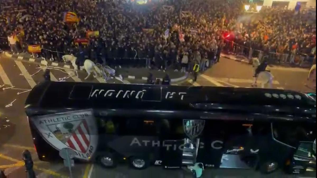 Latas, vasos, papel higiénico… cualquier objeto ha servido como arma arrojadiza contra el autobús del Athletic, que afortunadamente no parece haber sufrido daño alguno.