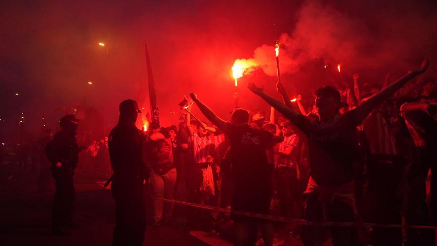 Los pupilos de Ernesto Valverde aplauden a los aficionados antes de subirse al autobús. Bengalas y gran ambiente.