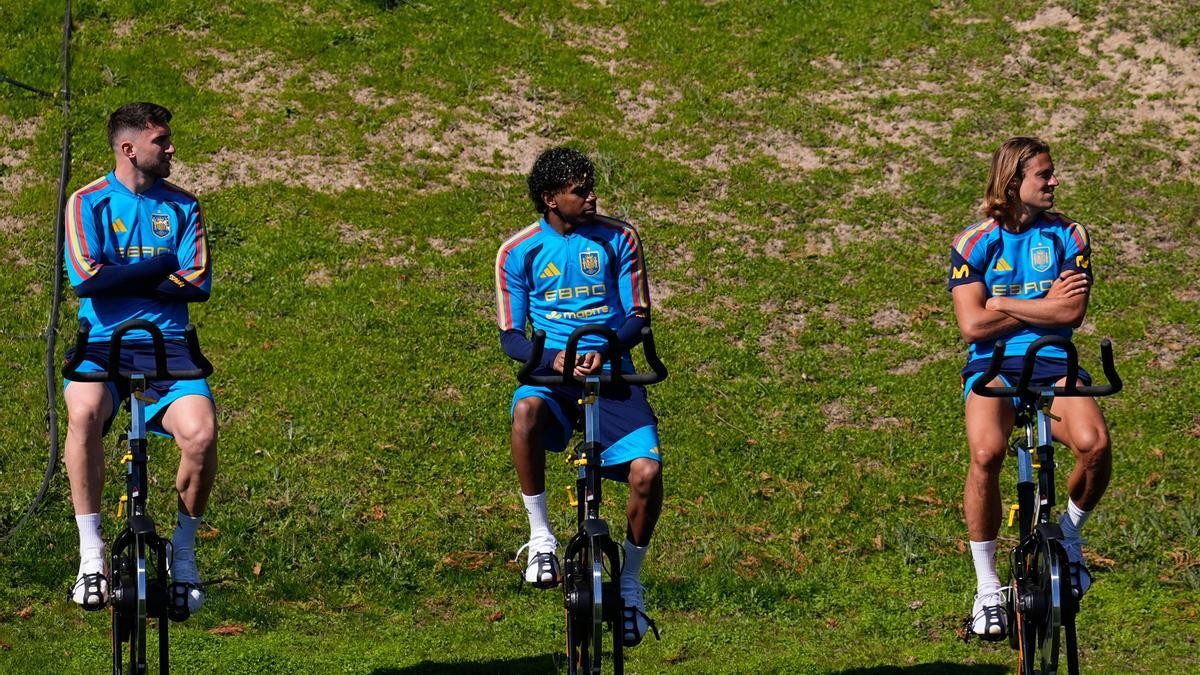 Laporte acabó completando todo el encuentro pero De la Fuente ha tomado la decisión de darle descanso el primer día de trabajo, como también ha hecho con Marcos Llorente y Lamine Yamal. Los tres realizaron bicicleta estática en una banda del campo de entrenamiento donde se ejercitaron el resto de internacionales, antes de series de estiramientos y tratamiento fisioterapeútico en el interior de las instalaciones.