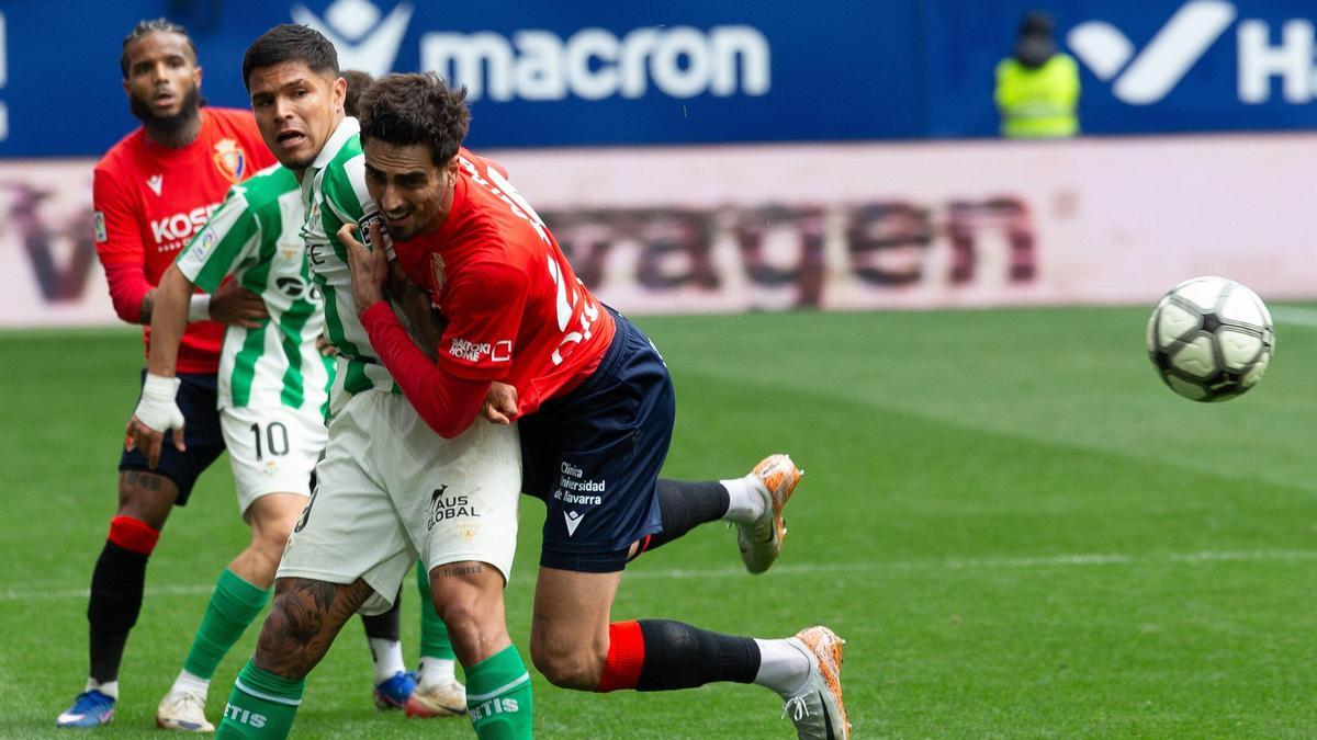 Y es que el colegiado del encuentro Miguel Sesma Espinosa le sacó tarjeta en el minuto 34 del empate navarro ante el Betis por un tremendo golpetazo a Sergi Altimira. A pesar de que Catena llegaba como apercibido, el colegiado no se lo pensó y le dejó condicionado con una amarilla durante casi una hora.