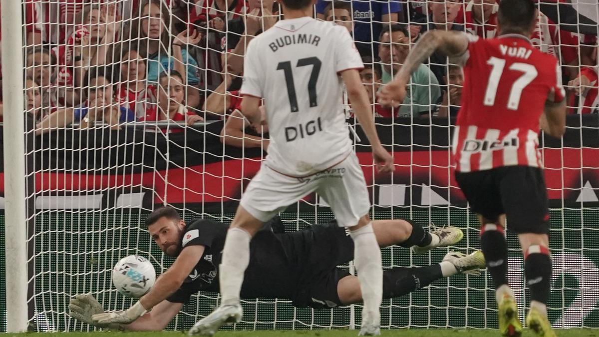 Budimir se elevó sobre la defensa del Athletic y conectó con el balón para mandarlo abajo y pegado al palo. Imposible para cualquier portero, pero no para el rojiblanco. Así, cuando parecía que la pelota se colaba, apareció la manopla de Simón para palmearla y, previo choque con el poste, mandarla fuera de sus dominios.