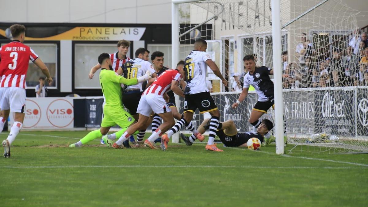 Por una chiquillada, el local Mounir vio dos tarjetas seguidas y el partido se puso franco para el conjunto vizcaino. Johaneko, con potencia, obligó a estirarse a Salvi Carrasco. Adrián Pérez disparó con su zurda. Un centro desde la derecha lo tocó Salvi para estrellarse en el palo. Korkut también disparó desde la frontal. Y sobre la bocina el partido acabó como empezó, con un zambombazo de Gift que dejó temblando el larguero.