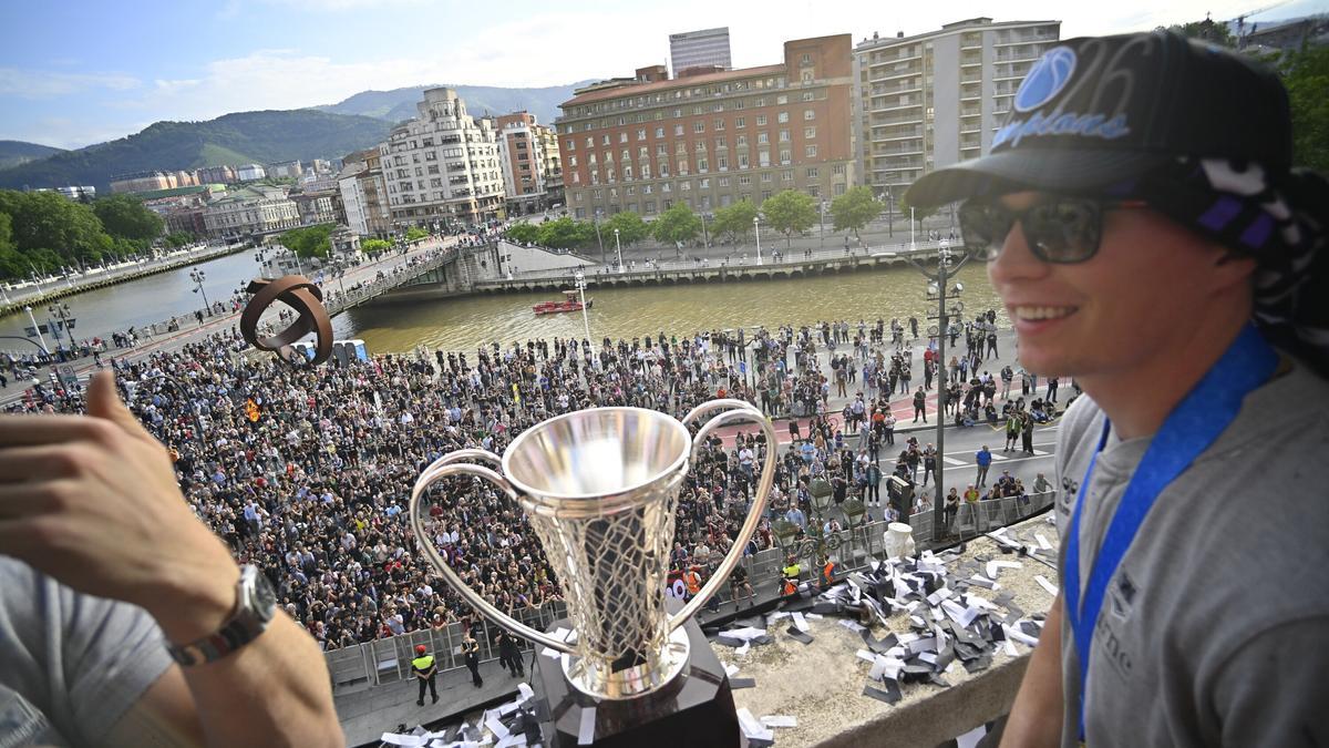 Sin tiempo para digerir lo conseguido, sin distancia para masticar lo ganado, la afición del Surne Bilbao se congregó en las escaleras del Ayuntamiento para rendir honores a los reyes de Europa. Y es que, tras la remontada al PAOK en la final de la FIBA Europe Cup que hizo estallar Miribilla, los hombres de negro compartieron con su gente su segundo título continental.