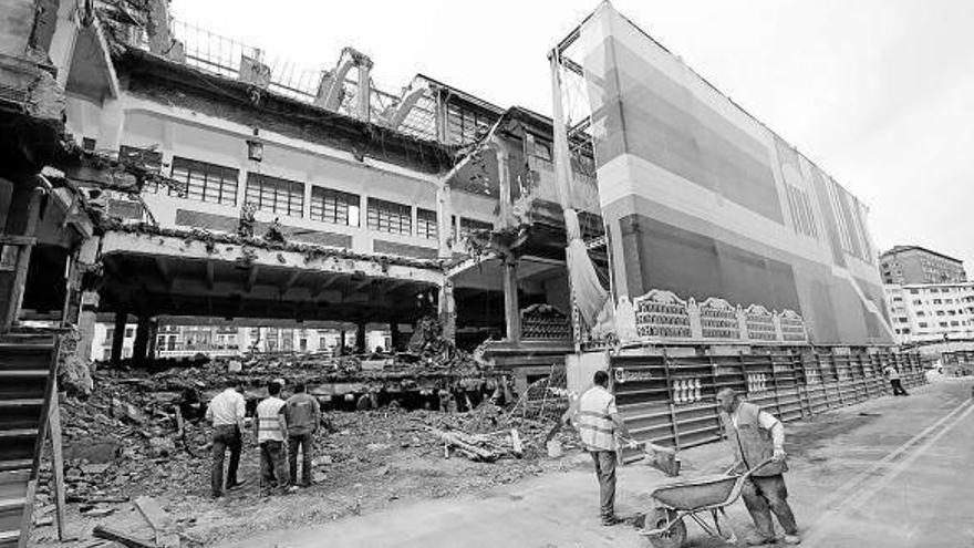 BILBAO. Durante la mañana de ayer los operarios procedieron a derribar las partes de la fachada del mercado de la Ribera que no se van a mantener por no tener un valor arquitectónico y necesitar un restauración. Se trata de la fachada más próxima a la Ribera lo que obligó a cortar el tráfico hasta el mediodía. Sin embargo el Área de Circulación y Transportes dispuso una ruta alternativa permitiendo la doble dirección en el puente de San Antón, para saliendo por Bilbao La Vieja llegar hasta el centro. Comienzan así las obras de la tercera fase del mercado de La Ribera cuya transformación mejorará el servicio. Foto: David de Haro