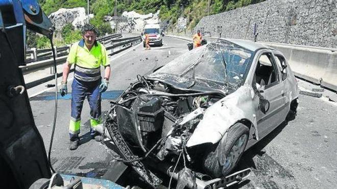 Bilbao. Tres personas resultaron heridas de diversa consideración ayer por la mañana tras un accidente registrado sobre las 11.40 horas, en la N-634, dentro del término municipal de Bilbao. El coche, un Peugeot 206, quedó destrozado en medio de la calzada ocupando los dos carriles dirección Galdakao. Pese a la brutalidad del impacto, -se convirtió en un amasijo de hierro- no hubo que lamentar daños personales graves y los tres ocupantes fueron trasladados en ambulacia a sendos centros hospitalarios. A consencuencia del siniestro, la N-634 permaneció cortada hasta que los operarios retiraron el vehículo y limpiaron la calzada. Foto: Pablo viñas