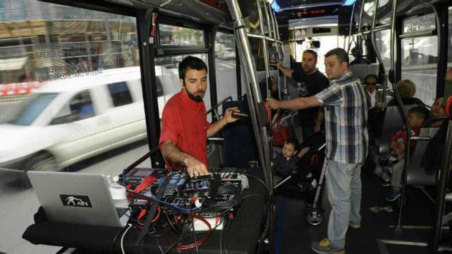 Jon Imanol López, José Francisco Amo y el pequeño Blas, de 3 años, fueron los primeros viajeros que cogieron el bilbobus de la línea 72 en el barrio de Rekalde. "Cuando hemos visto llegar el autobús hemos pensado: ¿qué es esto? Nos parece una idea estupenda pero no sabíamos a qué se debía. Nos tenemos que bajar en Indautxu, pero con esta música iríamos hasta el final del recorrido", contaban mientras grababan con el móvil la actuación que Diego Ain, "el hombre orquesta", interpretó dentro del autobús: una música biotrónica, sin utilización de instrumentos y solo creada por sonidos emitidos con la voz y el cuerpo, apoyada en la tecnología. "Es original y estupendo", explicaba Nieves Hernández. A pesar de que a muchos bilbainos les costaba relacionar el espectáculo con la exposición, hubo incluso quien se animó a bailar, como Isabel Díaz: "Es un lujo. Hay que bailar para alegrarse". En los primeros asientos viajaban Begoña Duro y Feliciana Sáez. "La música está un poco alta. Viene bien para animarse e incluso nos han dado caramelos". Y es que el conductor Javi Baz era el encargado de repartir ayer por la mañana unos paquetes de dulces -se repartirán alrededor de 8.000- que acompañaban a promociones de 2x1 para disfrutar de la muestra de Ernesto Neto en el Museo Guggenheim. Tal y como declaraba Katrin González, "hay que informar a la gente sobre las muestras del museo y acercar la cultura a la gente".
