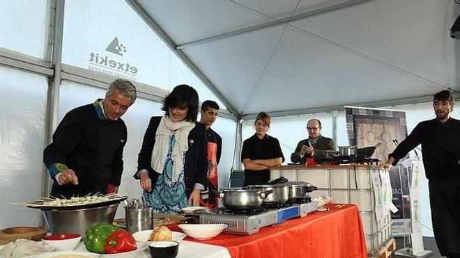 Para la elaboración del primer plato, Luis Crovetto, del Banco de Alimentos de Bizkaia, y Oihane Agirregoitia, concejala de Igualdad, Cooperación y Ciudadanía de Bilbao, hicieron las veces de pinches. “Este año, de alguna manera, queríamos relacionar el consumo de productos de comercio justo con el consumo de productos locales, ya que comparten objetivos en lo que respecta a unas condiciones dignas de trabajo y de salario en la cadena de producción”, indicó la edil instantes antes de batir los ingredientes en el escenario improvisado de la instalación donde se han dispuesto once puestos para las ONGD que “forman parte de un equipo de trabajo continuo a lo largo del año”.