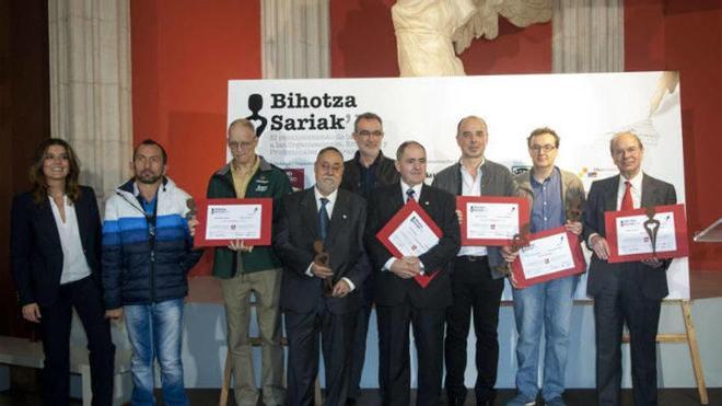 NADIE sabe si son cosas del destino o cuestión de azar. El caso es que a pocos metros de la Plaza Corazón de María, epicentro de Bilbao La Vieja, volvieron a entregarse los premios Bihotza Sariak. Con estas distinciones, que puso en marcha hace ocho años BilbaoHistoriko, los profesionales de los medios de comunicación quieren resaltar la labor que desarrollan empresas, entidades y personas en el campo de la “solidaridad, la responsabilidad social y la pasión por Bilbao y Bizkaia”. En la edición de este año han distinguido el “gran corazón” de Cafés Baqué, Saiatu, Fundación Guggenheim Bilbao, Asociación La Cruz de Oro, Carmelo Corada e Ibon Areso.