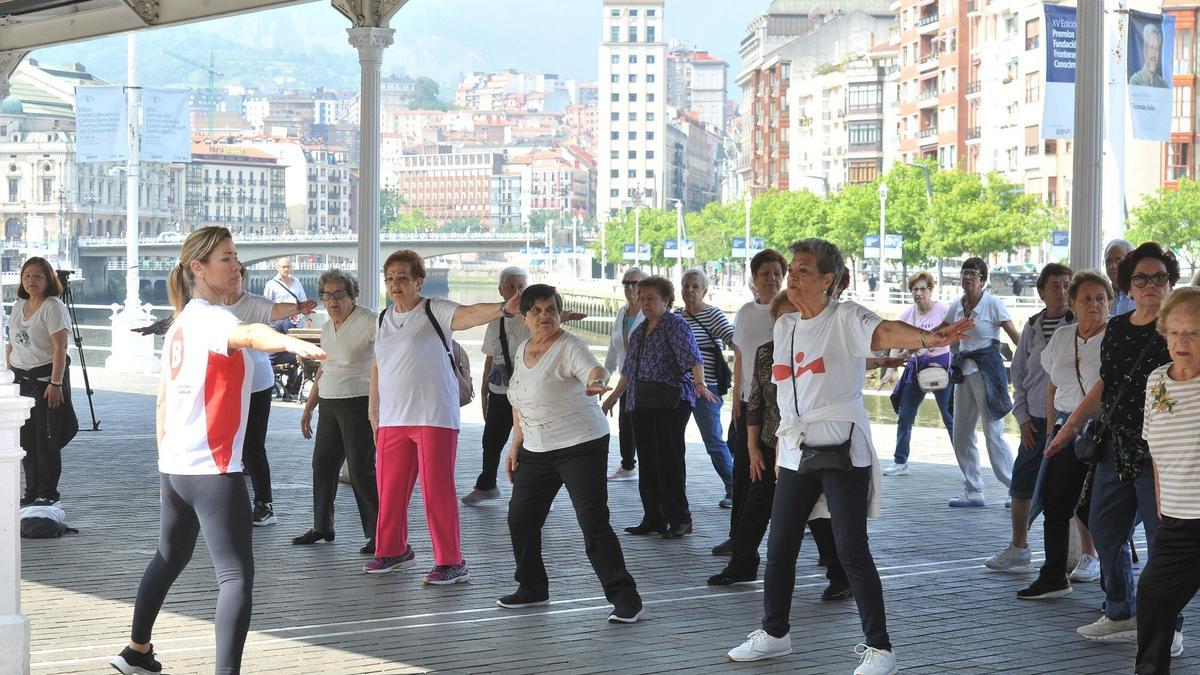Todo fue fiesta, jolgorio y sudor este jueves por la mañana bajo los Tinglados de El Arenal. Fue el escenario escogido para retomar la fiesta fin de curso del programa Salud para Personas Mayores del Área de Salud y Consumo del Ayuntamiento de Bilbao que se ha desarrollado entre los meses de octubre a junio.
