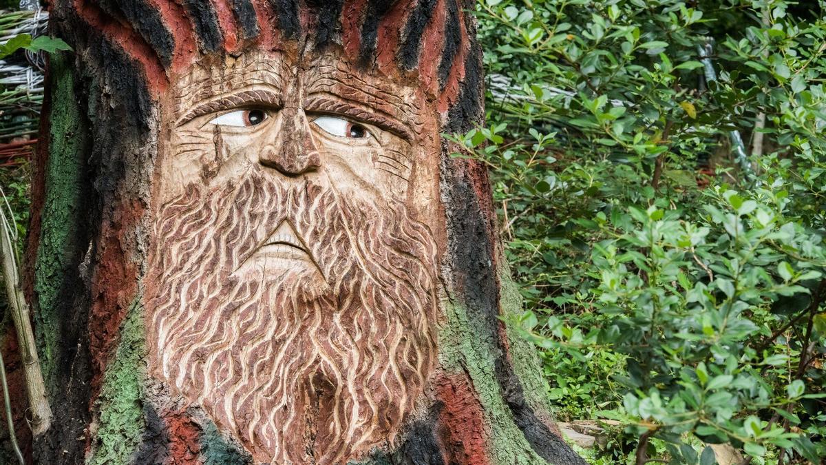 Ha continuado dedicado a la labor. Y ha añadido nuevas figuras, como cabezas de antílopes y búfalos enfrentados, serpientes que asoman entre el follaje o descienden de los árboles y la enorme cabeza de un genio del bosque esculpida sobre un tocón cuyas raíces quedan a la vista.