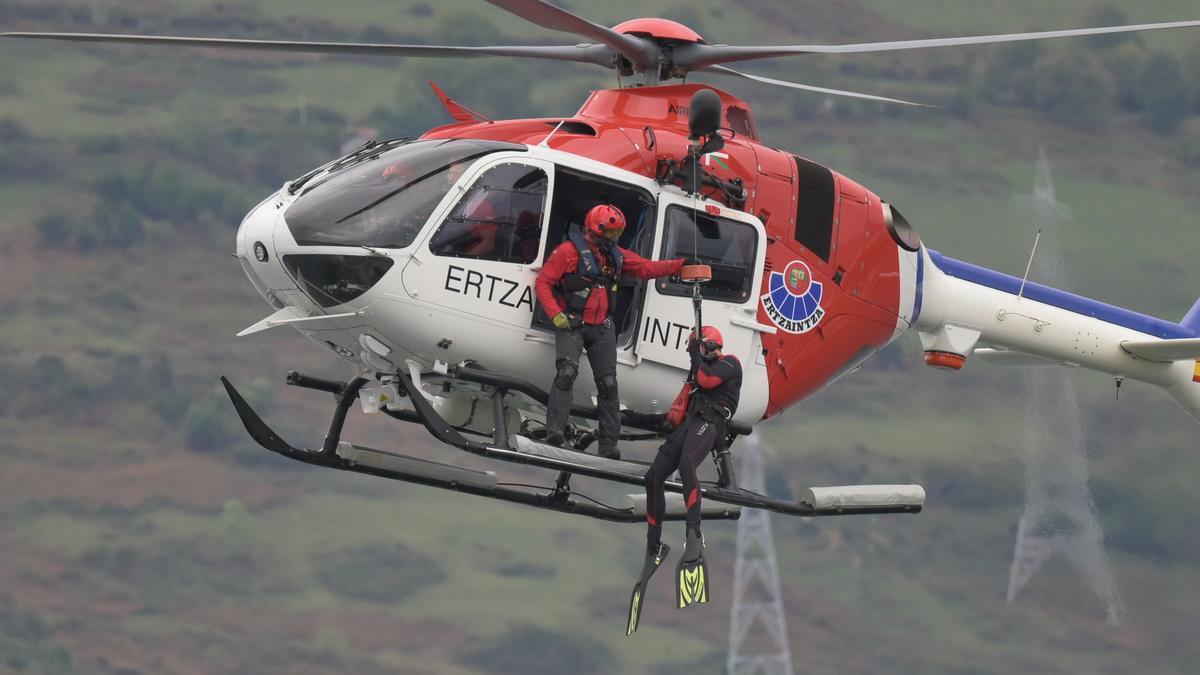 Y mientras la aeronave ha dado varias vueltas a la terminal de cruceros de Getxo captando la atención de las personas asistentes, una lancha de la Ertzaintza abandonaba a una persona en el agua para ser posteriormente rescatada. Tras dos vueltas de aparente reconocimiento de la zona de actuación, el helicóptero de la Policía vasca ha comenzado a volar a escasos metros de altura del agua. Nunca justo encima de la persona a rescatar ya que la fuerza de las aspas batiendo el agua –en un momento de la exhibición la movió con tal fuerza que mojó a los asistentes que se encontraban a ras de agua– podría provocar el ahogamiento de la persona en riesgo.