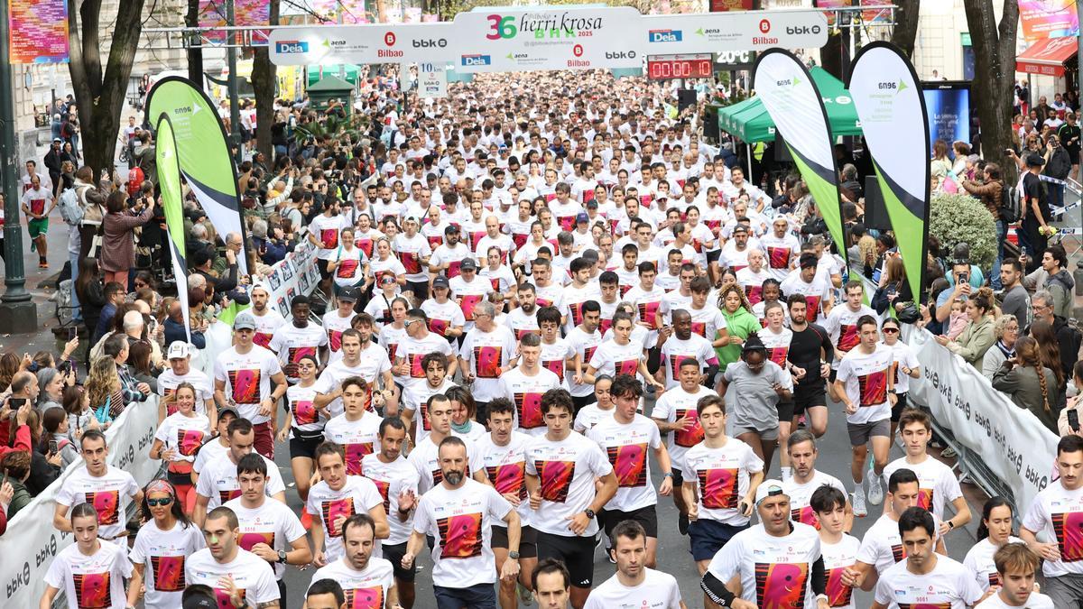 A las 11.00 horas se ha dado el pistoletazo de salida a la XXXVI edición de Bilboko Herri Krosa. La tradicional carrera popular ha vuelto a teñir las calles de la capital de blanco con una marea humana de atletas de todos los niveles y condición. Un total de 9.147 participantes, según los organizadores, se han sumado a la cita que cuenta con el patrocinio de DEIA y que esté año ha homenajeado a Javier Iturbe, alma máter de la prueba que falleció el año pasado.