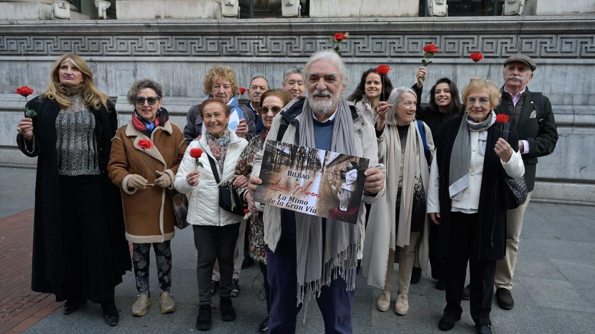 Era muy discreta, pero seguro que se fijaron en ella. En medio de la vorágine y el tránsito acelerado de la Gran Vía de Bilbao, Lucía Moreno, la mimo de la Gran Vía, se colocaba diariamente junto al Banco BBVA. Situaba su altillo y tras pintarse la cara de blanco, sujetaba una rosa y miraba fijamente al suelo con rostro triste e inmóvil. Falleció hace cuatro años a causa de una enfermedad y este sábado, coincidiendo con el día de Santa Lucía, la Asociación Artística Vizcaina le ha dedicado un homenaje con rosas y poesía justo en el punto desde donde tantos años contempló la vida.