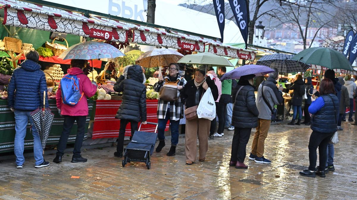 Con la mirada puesta en el cielo, ya que según las previsión de la Agencia Vasca de Meteorología se esperaba algo de lluvia, vizcainas como Susana Mato lo tenían claro: "Vengo todos los años llueva, truene, o lo que sea", matiza. Siendo una de las primeras clientas de Santo Tomás, Mato se lleva a casa "un poco de chorizo, pan y algo más".