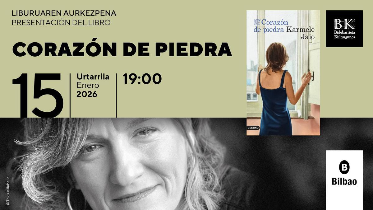 - Urtarrilak 15, osteguna. “Corazón de piedra”, Karmele Jaio. Txani Rodriguez idazle eta kazetaria izango da berarekin aurkezpenean.