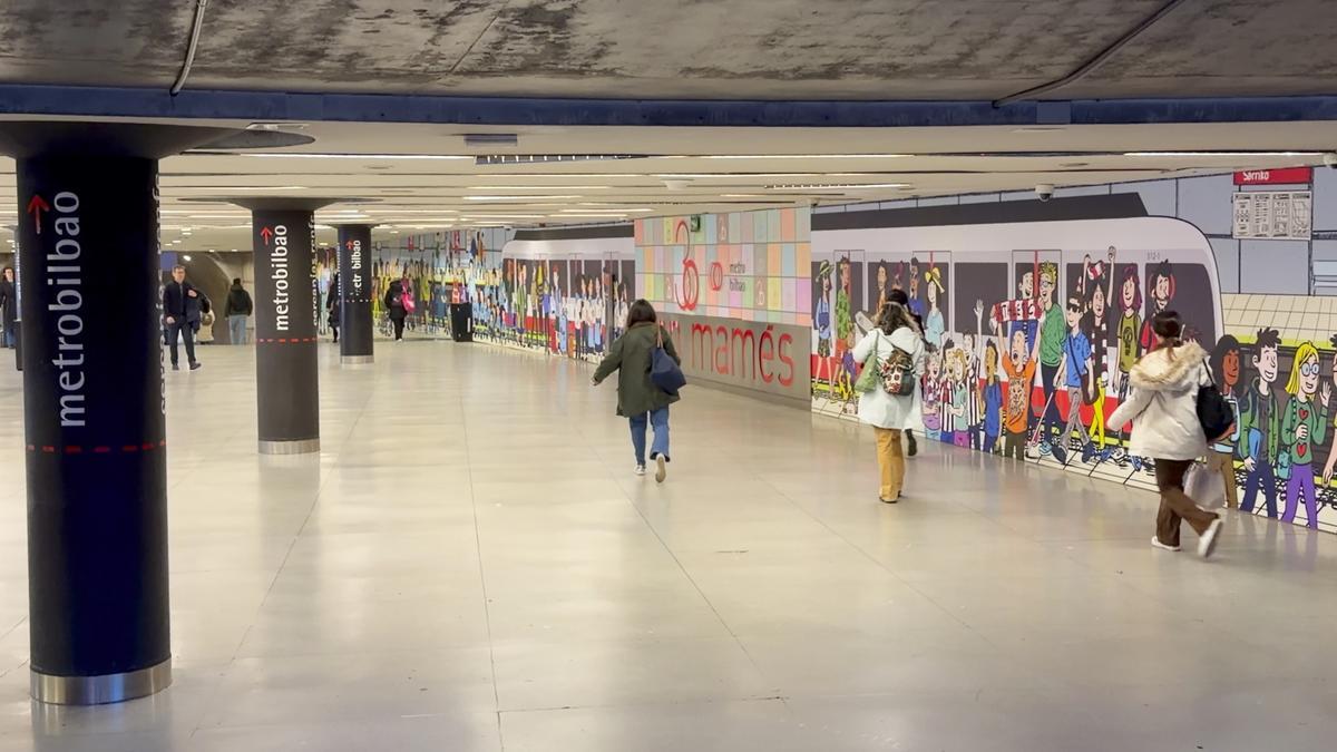Metro Bilbao ha convertido la intermodal de la estación de San Mamés en un homenaje a todos sus usuarios. En la pared principal de este espacio, uno de los puntos con mayor tránsito de toda la red, luce un mural de casi 54 metros de longitud y 2,5 metros de altura que retrata una escena cotidiana en cualquier estación del suburbano.