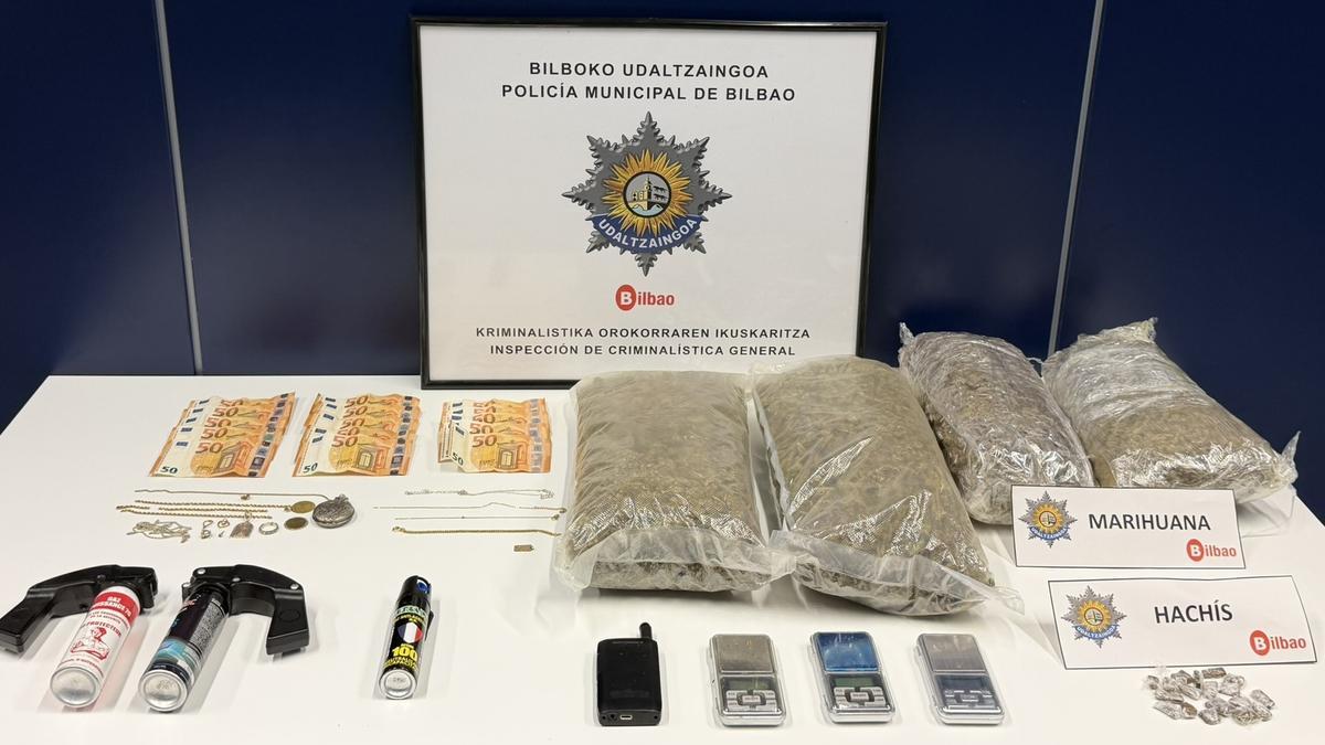 Halaber, 16 gramo haxix aurkitu zituzten, dosi txikitan, saltzeko prest. Era berean, substantzia pisatzeko erabilitako hiru doitasun-baskula, hainbat bitxi, 750 euro (50 euroko billetetan), polizia-defentsarako bi spray eta komunikazio-emisora bat konfiskatu zituzten.