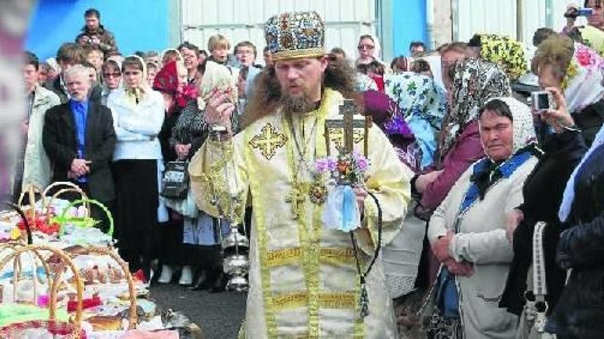 Hacía frío, mucho frío. Las nubes grises amenazaban con descargar lluvia, pero dieron tregua a los ortodoxos que se situaron alrededor de la mesa, dejando espacio al obispo. Los hombres acudieron de traje y debían presentarse con barba de varios días. Las mujeres lucían su mejores galas, falda larga y pañuelos con flores cubriendo el pelo. Tampoco faltaron los más pequeños, que jugaban ajenos al acontecimiento. Todos acudieron a bendecir los alimentos que posteriormente llenarían sus mesas. Pan, huevos, carne... La comunidad ortodoxa siguió atentamente las palabras y oraciones del obispo, ataviado con una túnica dorada y una ostentosa corona de piedras de colores. Los feligreses se santiguaron en contadas ocasiones, oraron y al unísono entonaron diversos cánticos en ruso y repitieron la frase Hristos vaskresi!