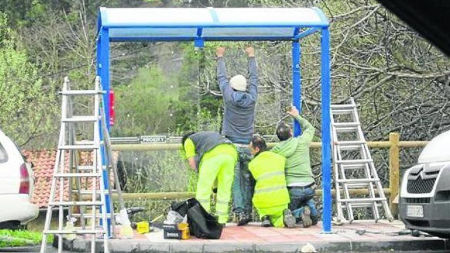 Muskiz. Tal como había adelantado el alcalde de Muskiz, Gonzalo Riantxo, operarios municipales procedieron en la jornada de ayer a la colocación de una marquesina en el barrio de Santelices que dará cobijo a los usuarios de la línea de Bizkaibus en dirección a Sopuerta, así como a varios alumnos de ikastolas y colegios de la zona. Dicha instalación, a la que seguirá otra similar en el barrio de Laureta, surge tras el compromiso municipal de dar respuesta a las demandas de los vecinos de la zona que construyeron una rudimentaria marquesina para hacer patente su necesidad. La inversión municipal ronda los 4.000 euros. Foto: E. Zunzunegi