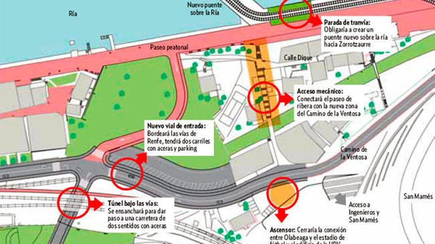Ahora el Ayuntamiento se va a volcar la conexión con el resto de la ciudad. Lo más inmediato es la continuación del remodelado Camino de la Ventosa que se ha acometido con el nuevo San Mamés. Se ha diseñado un vial con aceras, que sustituirá al viejo paso estrecho de un solo carril, parte del cual transcurrirá en túnel y desembocará al lado del acceso actual a la zona de la ribera.