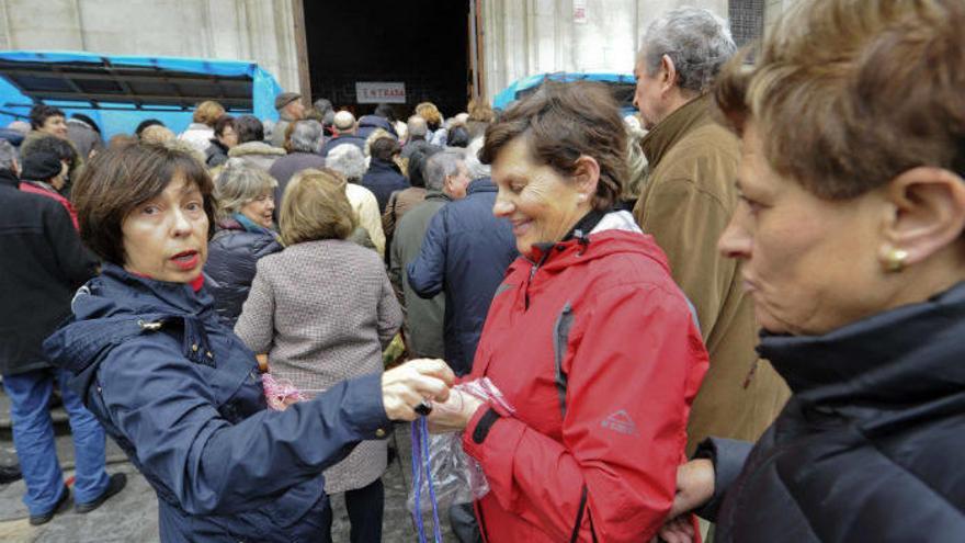 Un año más, miles de personas se acercaron hasta la iglesia de San Nicolás, en El Arenal bilbaino, para cumplir con la tradición. Lo primero que había que hacer era proveerse de cordones, que había de todos los colores, hasta del Athletic. Y para ello estaban los puestos que rodeaban la iglesia desde primeras horas de la mañana. En los tenderetes se podía adquirir, además de los cordones, los dulces típicos de san Blas como son las tradicionales rosquillas, las tortas, galletas y, por supuesto, los caramelos de malvavisco. A media mañana no daban a basto los vendedores. “Esto es una locura”, decía uno de ellos, “la gente coge los cordones sin pedir permiso y más de uno se va sin pagar”. Haciendo cola en uno de los puestos estaban Maite y Margari, dos amigas de Lezama que habían llegado hasta Bilbao en tren “haciendo transbordo en Lutxana para coger el metro”. Estas dos mujeres, “ya jubiladas”, comentaban que llevan muchos años asistiendo a Bilbao el día de San Blas. “Yo recuerdo”, comentaba Maite, “que de pequeña venía con mis aitas y un hermano, y para mí era toda una fiesta porque pasábamos todo el día en Bilbao; nos llevaban a comer a un bar que había en la calle Somera”. Su amiga Margari también tiene unos bonitos recuerdos. “Yo empecé a venir de más mayor, cuando estudiaba Secretariado en la academia Almi; y ese día nos escapábamos un rato de clase para bajar a San Nicolás”. Ayer no tenían prisa. Esperaron su turno para hacerse cada una con media docena de cordones y un par de bolsas de caramelos. “Son para los hijos y nietos”, decía Margari mientras se disponía a subir las escaleras que dan acceso al interior de la iglesia. La tradición dice que deben de ser bendecidos para que tengan el efecto sanador. Así que Maite y Margari querían recibir el agua bendita a pesar de que en todos los puestos callejeros se aseguraba a los clientes que todos los productos tenían el visto bueno de san Blas. “No nos fiamos”, decía Maite.