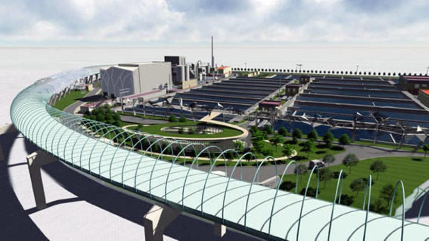 La segunda parte del proyecto del pabellón materializará el itinerario de los visitantes por la depuradora y para ello se construirán una pasarela de acceso desde el terreno a la cubierta del edificio. Será una senda peatonal que transcurrirá a cota de terreno por diferentes puntos de interés de la depuradora y un tramo elevado del mismo itinerario que constituirá a la vez un elemento de conexión, una atalaya sobre diversos elementos de la depuradora y una pantalla visual.