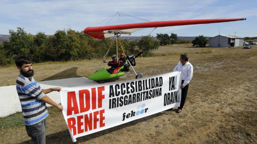 CON muchos nervios y algo de miedo pero con una gran sonrisa. Así se subió ayer María Luisa Goikoetxea en un ultraligero para demostrar a Adif y Renfe que para una persona con movilidad reducida es más fácil volar que acceder al tren de cercanías que conecta Orduña con Bilbao.