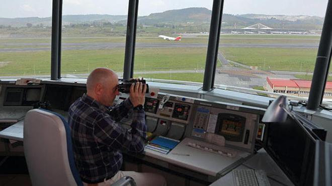 Son las 13.09 horas. Cielo despejado con alguna nube y un ligero viento. Buenas condiciones de visibilidad y no hay apenas tráfico aéreo. Estamos en el fanal de la torre de control del aeropuerto de Bilbao, la zona de vigilancia más elevada. Loli Iturriaga observa en el amplio monitor del radar dos vuelos en aproximación que llegan desde el monte Oiz. Su compañero, Ramón García, mira con unos potentes binoculares la parte más alejada de la pista principal 12-30 ahora tranquila. Loli y Ramón son dos de los controladores que están de turno en este puesto de vigilancia tan esencial para que la circulación de las aeronaves sea “al 99,9% segura”, explica Carlos Balboa, el tercer miembro del equipo que sustituye a uno u otro de sus compañeros cuando efectúan la parada obligatoria tras hora y media de actividad.