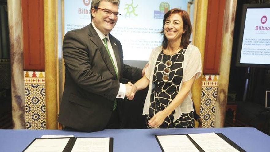 El Ayuntamiento de Bilbao y el Consorcio Haurreskolak firmaron ayer un protocolo de colaboración para regular el funcionamiento de las nuevas plazas de educación infantil en el ciclo de 0 a 2 años que se van a crear en Bilbao. Así, las haurreskolas de Bilbao contarán en los próximos años con un total de 670 plazas distribuidas en 15 centros.