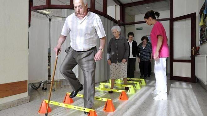 A María Guadalupe la traen por la calle de la amargura los bordillos. “Aunque intento no hacerlo, todavía arrastro un poco los pies”, reconoce. No obstante, supera sin problemas la hilera de barreras dispuestas en el suelo y apenas se le escapa algún pie del sendero confeccionado con unos hexágonos. Son tan solo algunos de los ejercicios con los que aprenden a superar escalones o a dar zancadas más largas. “Paso largo, no se puede pisar el aro, que da calambre. Vamos, campeones”, les anima María. “Esas manos”, le llama la atención a Juana de la Vega, una usuaria del centro de día que tiende a cruzar los brazos sin darse cuenta. “Si los tienes libres y te tropiezas, te puedes apoyar”, explica esta octogenaria, que una vez se cayó en el pasillo de su casa. “Tuve una racha que estaba muy mareada. Me asusté porque estaba en la cama, me levanté al baño, me caí y no me podía levantar”, relata y reconoce que le ha quedado el “miedo” justo para caminar siempre con precaución. “Si tengo que cruzar un paso de cebra, espero a que no venga ningún coche para pasar. Me aseguro. Procuro no andar a lo loco”, dice.