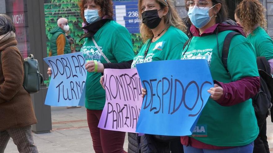 Manifestación. ELA, LAB, CC.OO. y UGT, hicieron ayer martes tres convocatorias diferentes, en defensa de una mejora de las condiciones laborales y de los ratios actuales de las 5.000 trabajadoras empleadas en las residencias concertadas y privadas de Bizkaia. Dos manifestaciones diferentes por la mañana en Bilbao visualizaron unas movilizaciones que los sindicatos reconocieron no saber cuantificar por los servicios mínimos “abusivos” del 100% decretados por el Gobierno vasco.